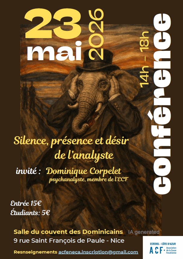 La première séance le 23 mai 2026 recevra Dominique Corpelet psychanalyste à Paris qui évoquera trois termes : Le Désir, La Présence et le Silence de l'analyste.